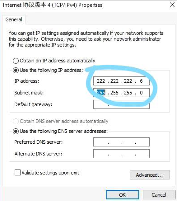 5. Cài địa chỉ IP như hình dưới, địa chỉ IP có thể cài 222.222.222.*(* số cuối từ 2~221 ), subnet mask cài 255.255.255.0