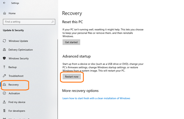 3. Click [Recovery]-[Advanced startup]-[Restart now]