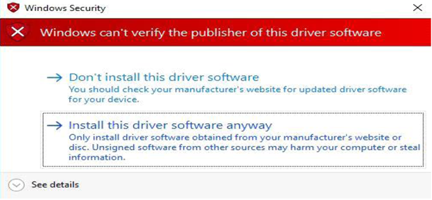 Lưu ý: nếu hiện cửa sổ sau nghĩa là cài driver không thành công, kiểm tra và thực hiện lại theo các bước như trên.