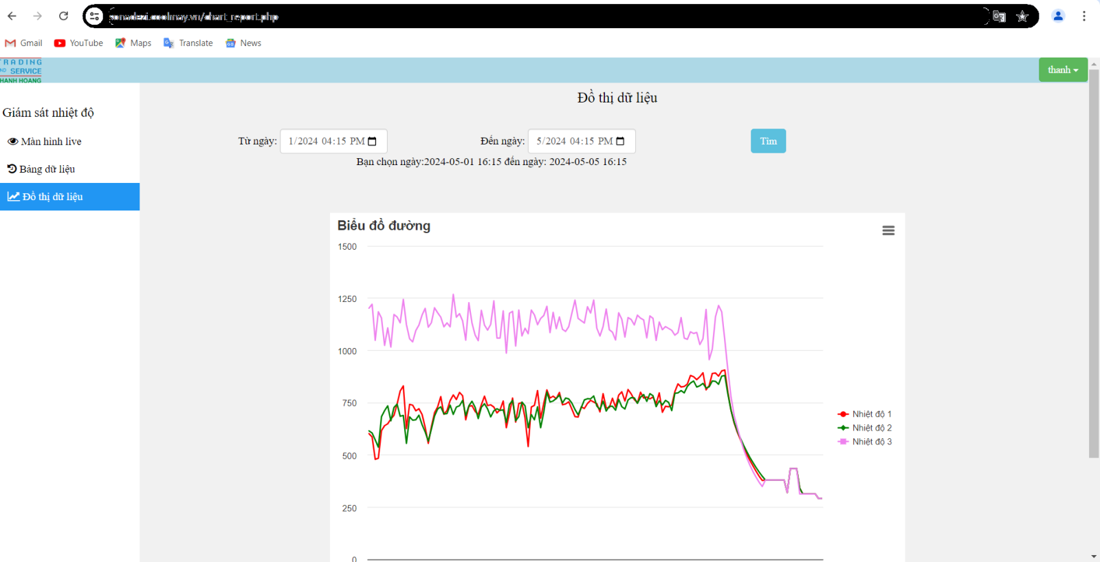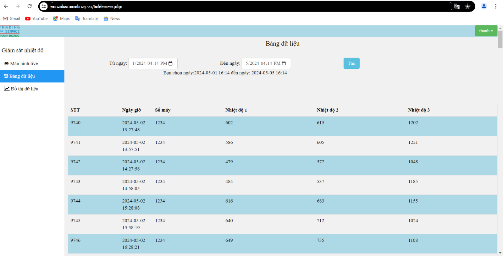 Xem lại lịch sử theo thời gian lựa chọn dạng bảng: Trang này hiển thị lịch sử dữ liệu nhiệt độ theo dạng bảng trong khoảng thời gian được lựa chọn.